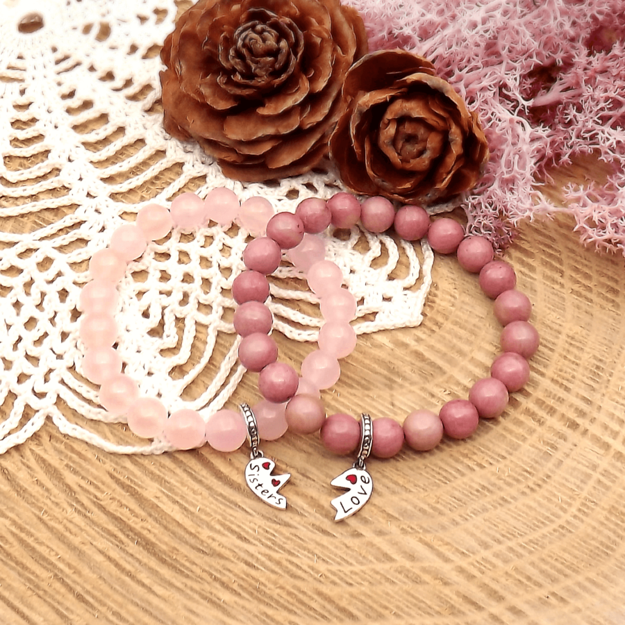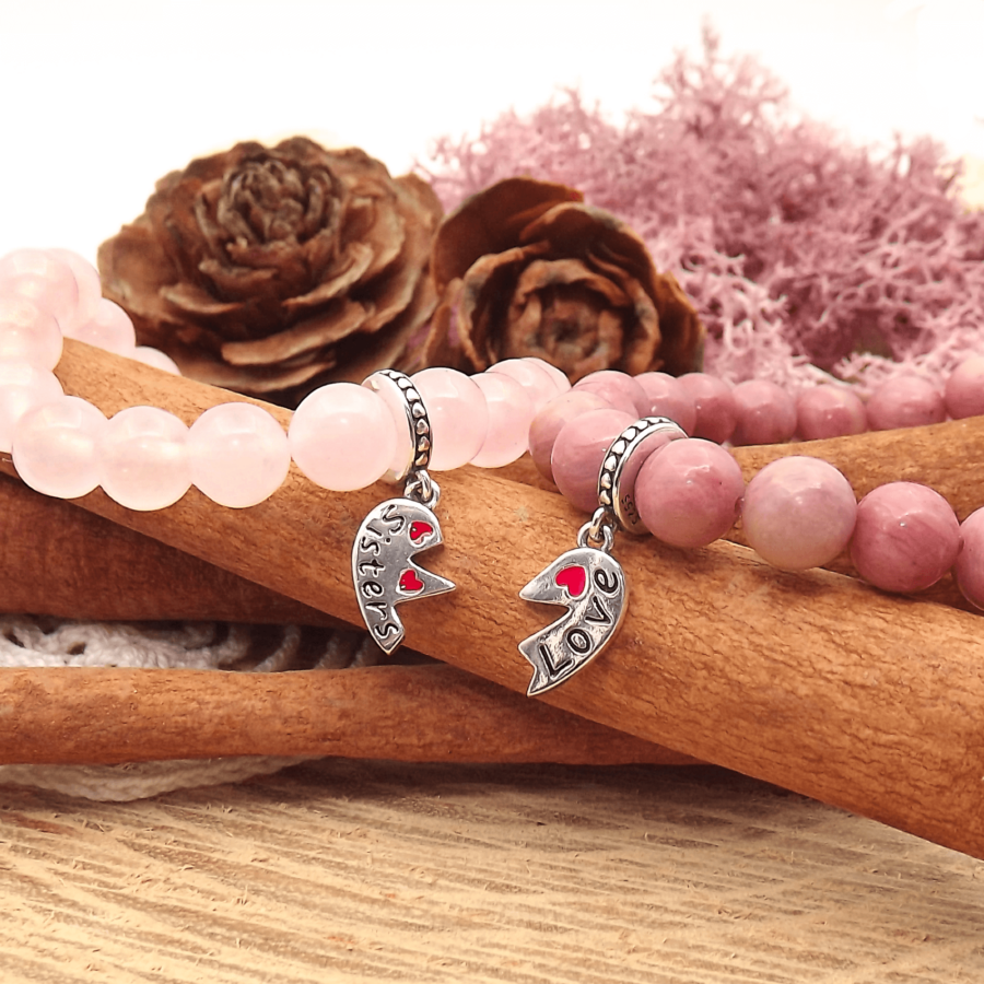 Rózsakvarc karkötő Sisters félszív medállal és rodonit karkötő Love félszív medállal...ugye Te is szívesen meglepnéd a tesód, egy ilyen karkötővel? :)