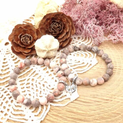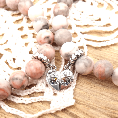 Zebra jáspis barátság karkötők kis strasszos félszív medálokkal.