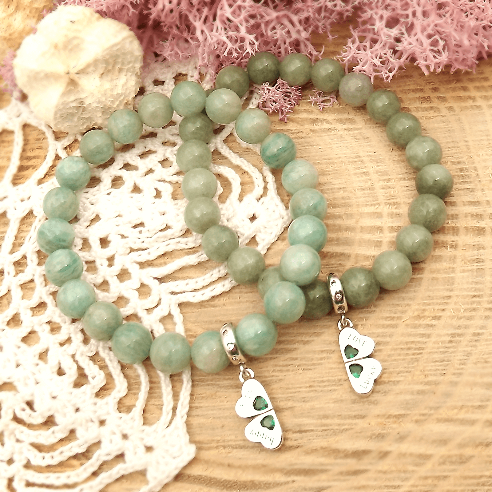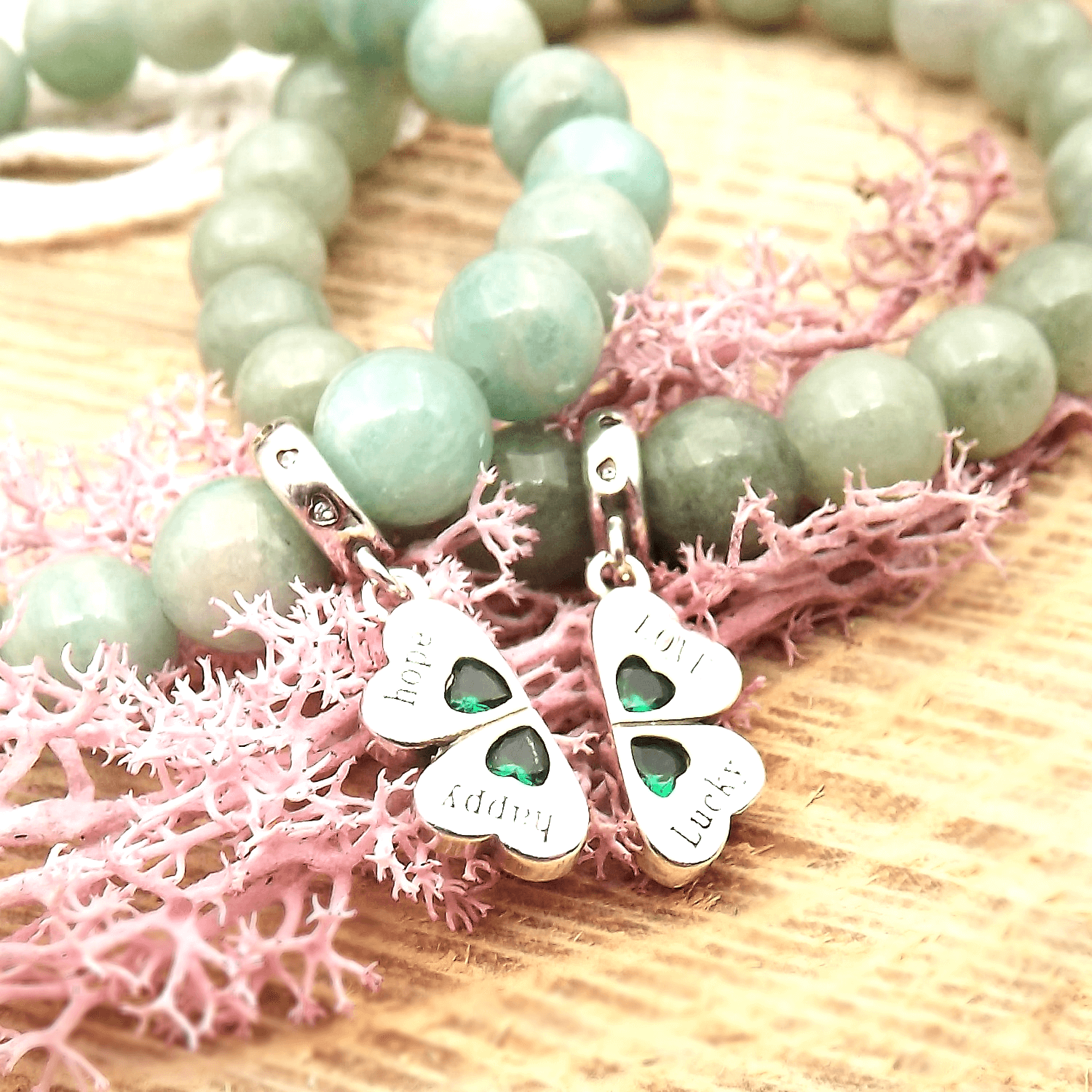 A két karkötő amazonit és zöld jáde ásványokből készült két (fél)lóhere medál díszítve.