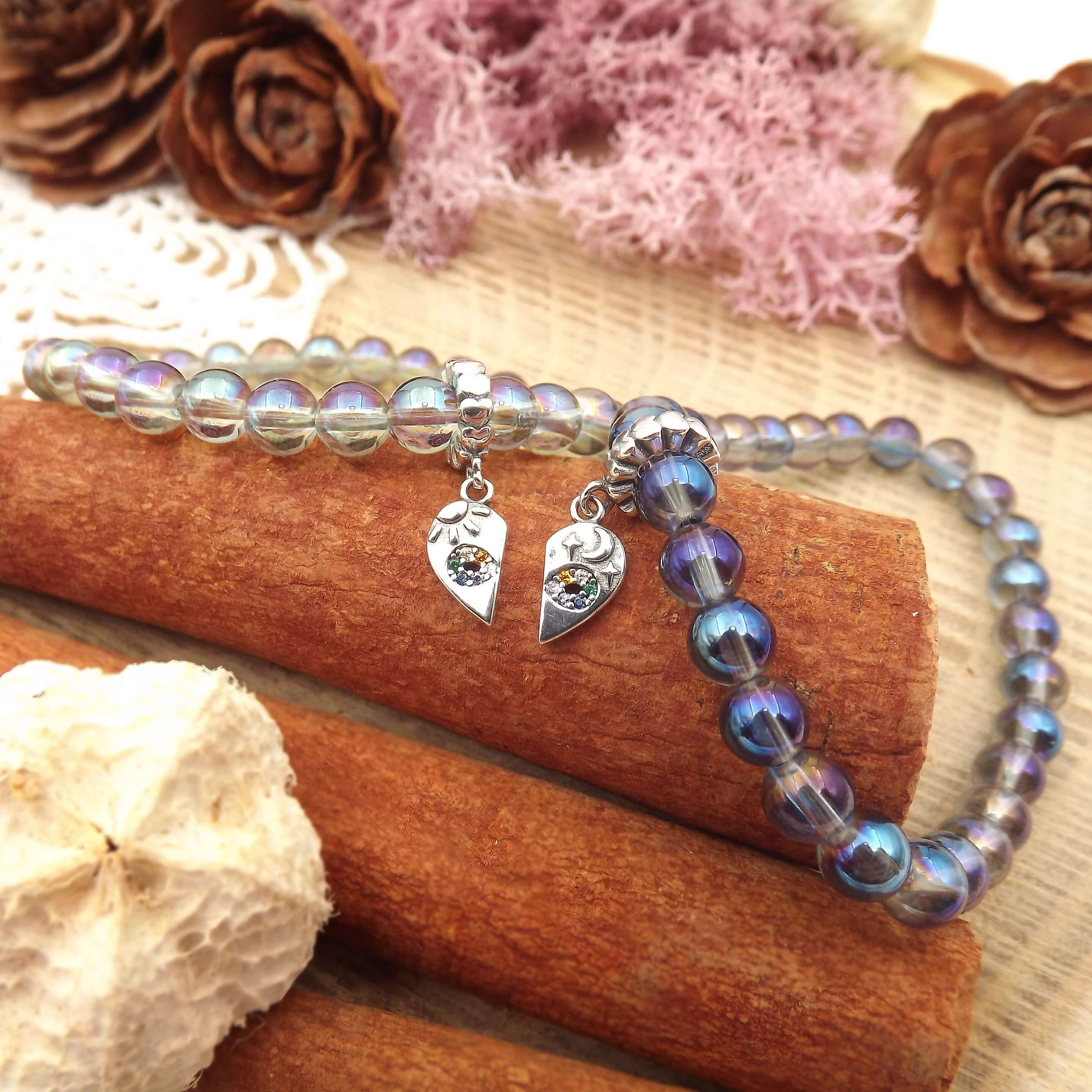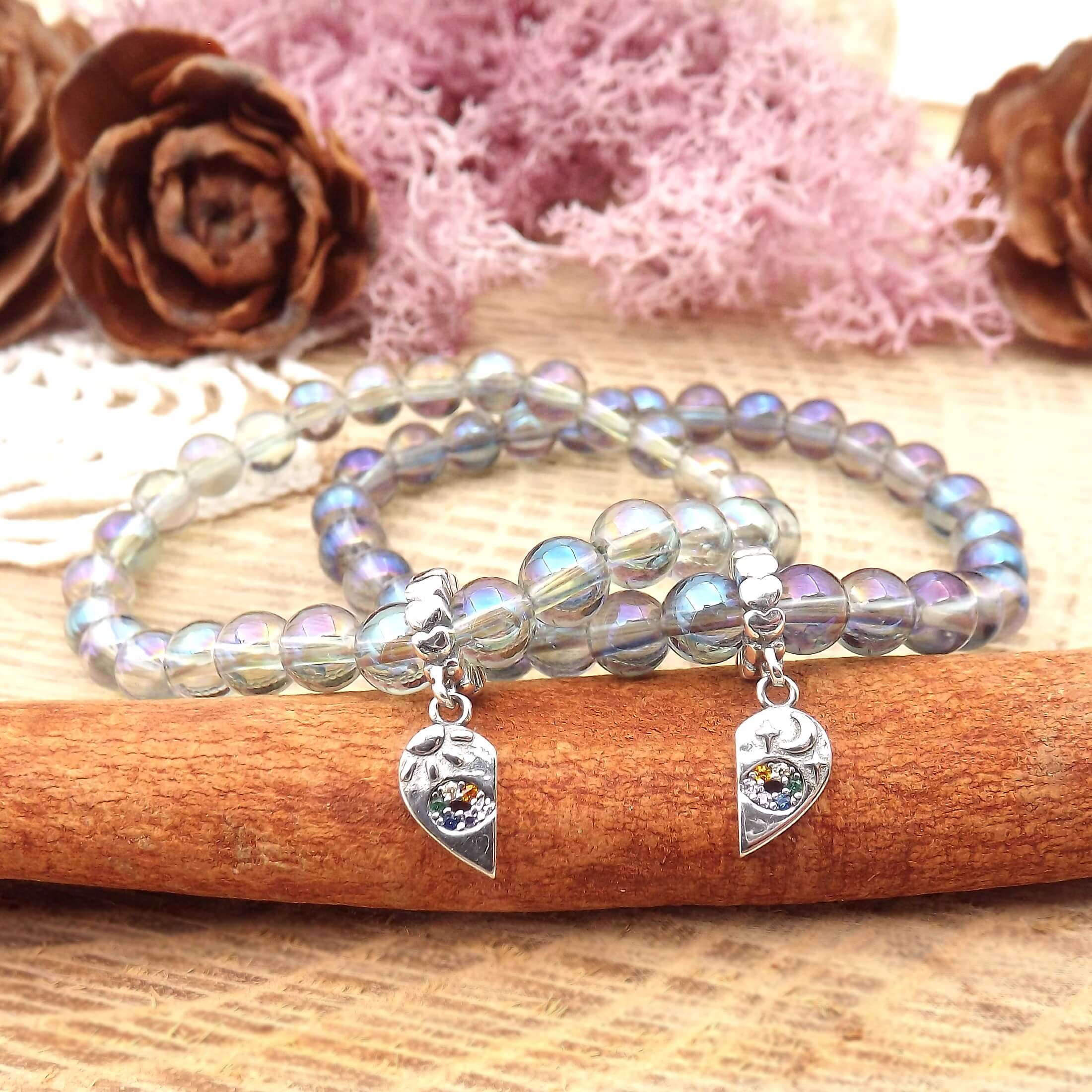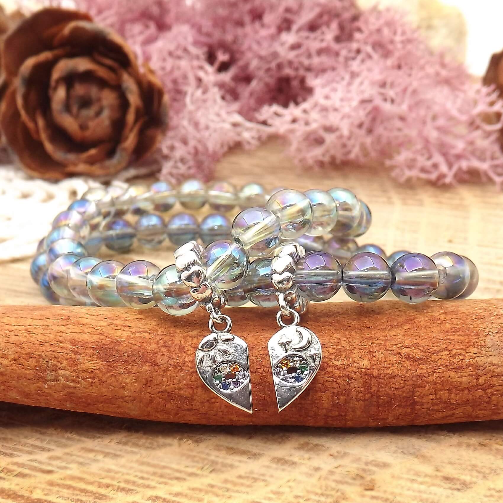 Halványzöld és kék aurakvac ásvány karkötők, melyeket színes strasszokkal kirakott végtelen jeles félszív medál díszít.