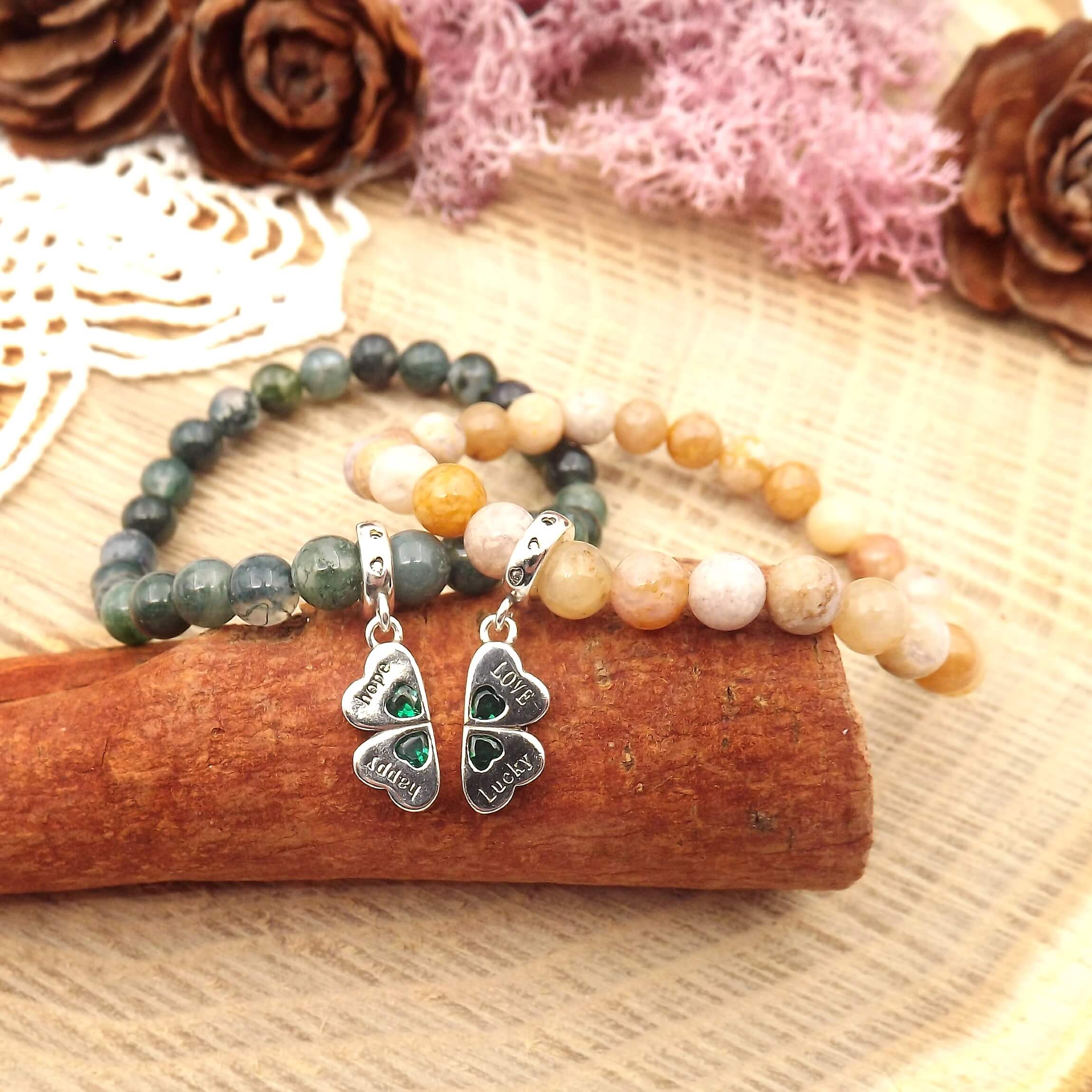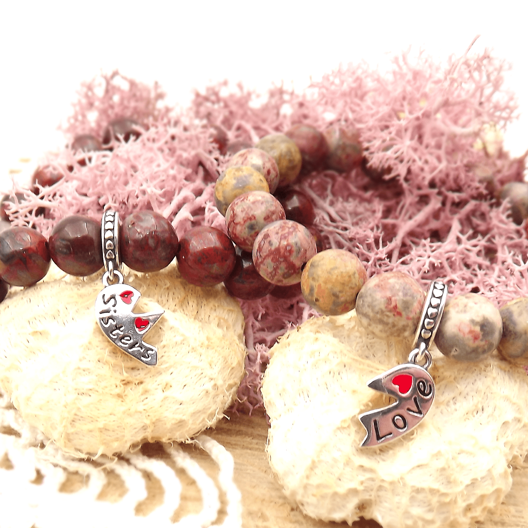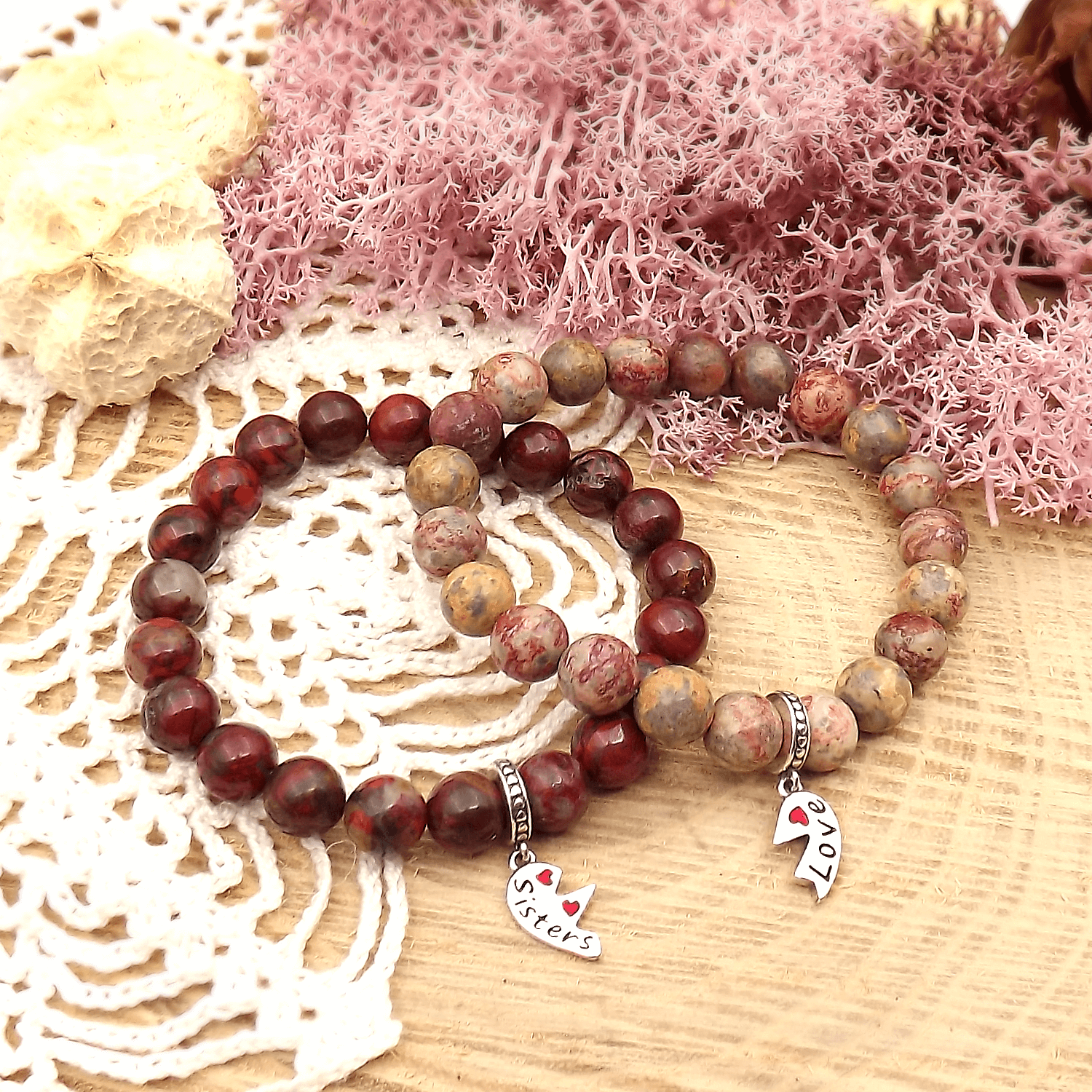 Breccsa jáspis és leopárd jáspis tesó karkötők Sisters és Love feliratú medálokkal.