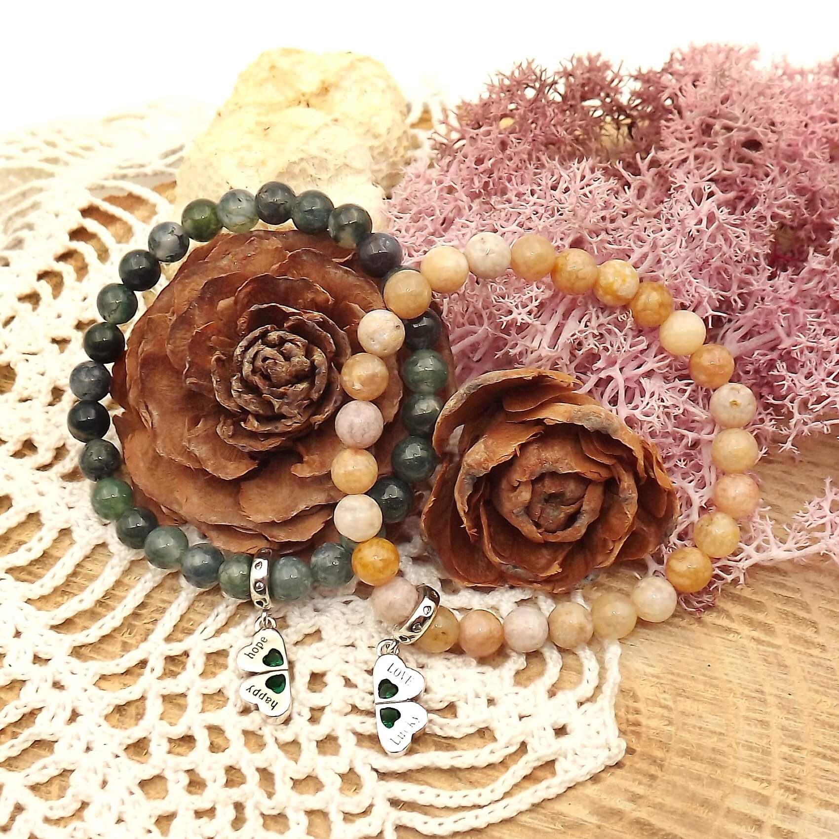 Sárga és zöld mohaachátból készült karkötőpár zöld strasszos lóhere medállal díszítve.