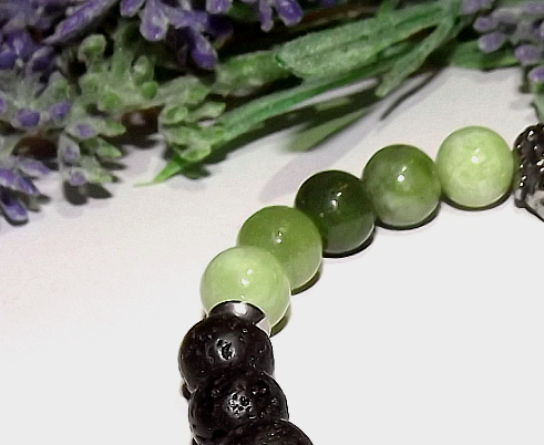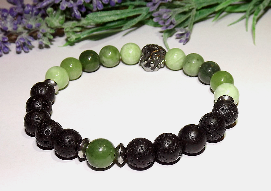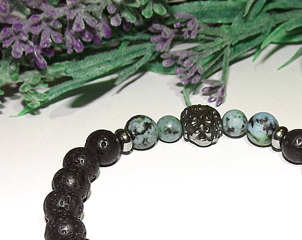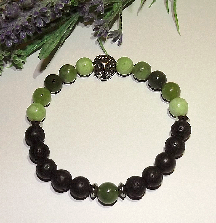 Az Őserő illatozó lávaköves karkötő 8mm-es fekete lávakő, mohaachát és jáspis ásványgyöngyből készült rozsdamentes acél köztesekkel és oroszlánfejjel díszítve. Az Őserő az iIlatozó karkötőim első darabjai között született, így kiemelt gondot fordítottam mind a tervezési, mind a kivitelezési folyamatokra.