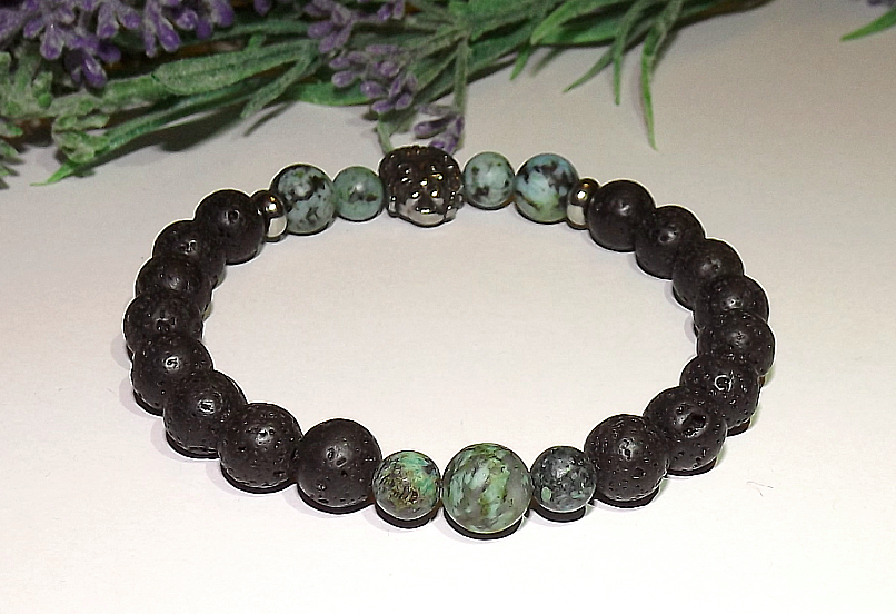 Az Uralkodó illatozó lávaköves karkötő 8mm-es fekete lávakő és afrikai türkiz, valamint 6mm-es afrikai türkiz ásványgyöngyből készült rozsdamentes acél oroszlánfejjel díszítve. Az Uralkodó az iIlatozó karkötőim első darabjai között született, így kiemelt gondot fordítottam mind a tervezési, mind a kivitelezési folyamatokra.