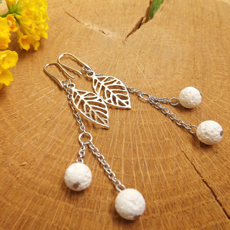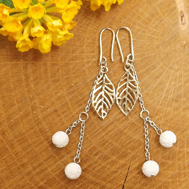 A Carla fehér leveles illatozó lávaköves fülbevaló 6 mm-es, fehér lávakövekből, ezüst levelekből és rozsdamentes acél alkatrészekből készült. A fülbevaló hosszanti designja igazán nőies darabbá teszi.