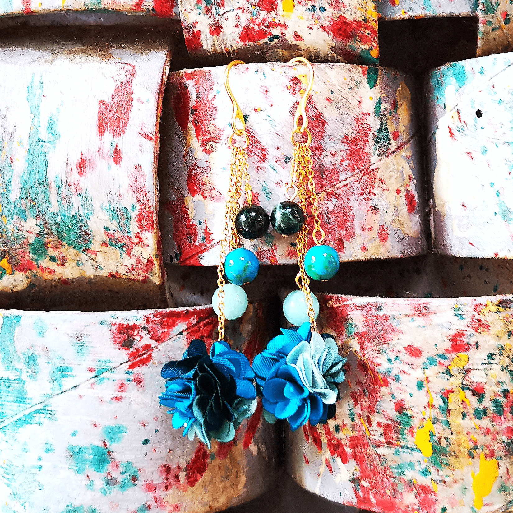 A [PRODUCT] 8 mm-es, mohaachátból, krizokollából, burmai jádéból, több árnyalatú, türkiz virágbojtból és arany színű, rozsdamentes acél alkatrészekből készült.