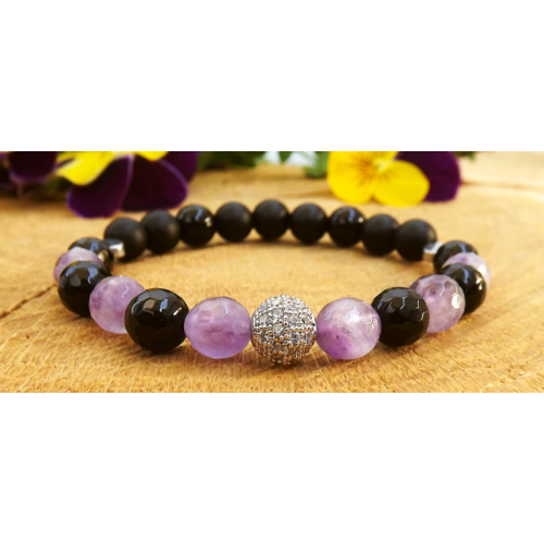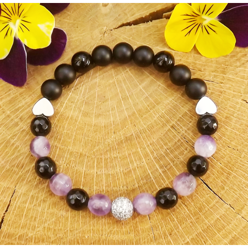szívek között ametiszt és ónix ásványgyöngy karkötő